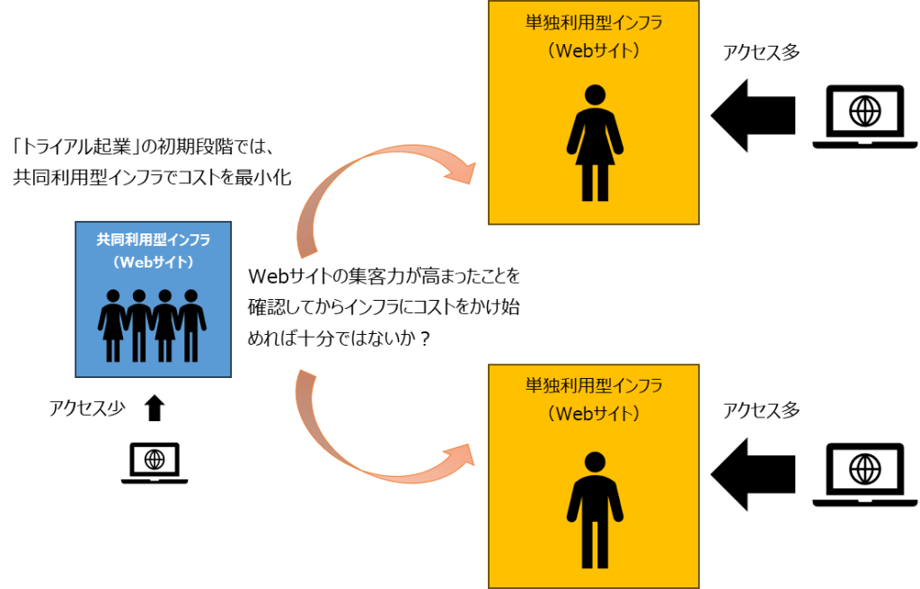 そこそこ有名なWebサイトのように1日で何万、何十万というアクセスが来るようなものを複数共有させて動作させるのは性能面で厳しいものがありますが、「トライアル起業」としてお試しに近い形のWebサイトであれば共同利用型にしても十分に運用できる、という見立てです。